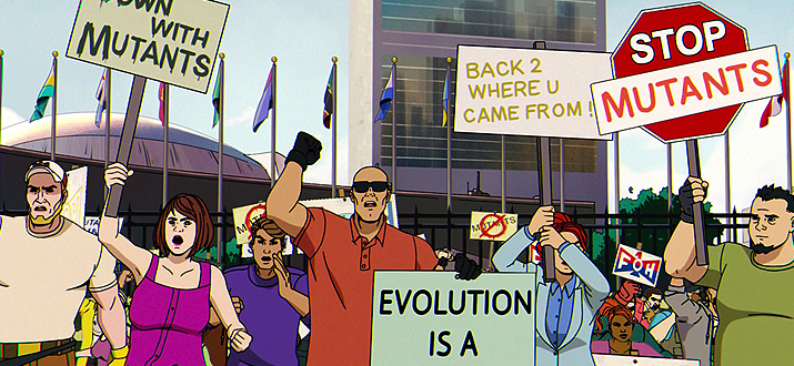 Плакаты: Долой мутантов, Вернитесь откуда пришли, Остановите мутантов, слово «Мутанты» со знаком запрета, флаг и инициалы «Друзей человечества», а также «Эволюция…» (дальше не видно). Также был крик «Выходите сюда, трусы»